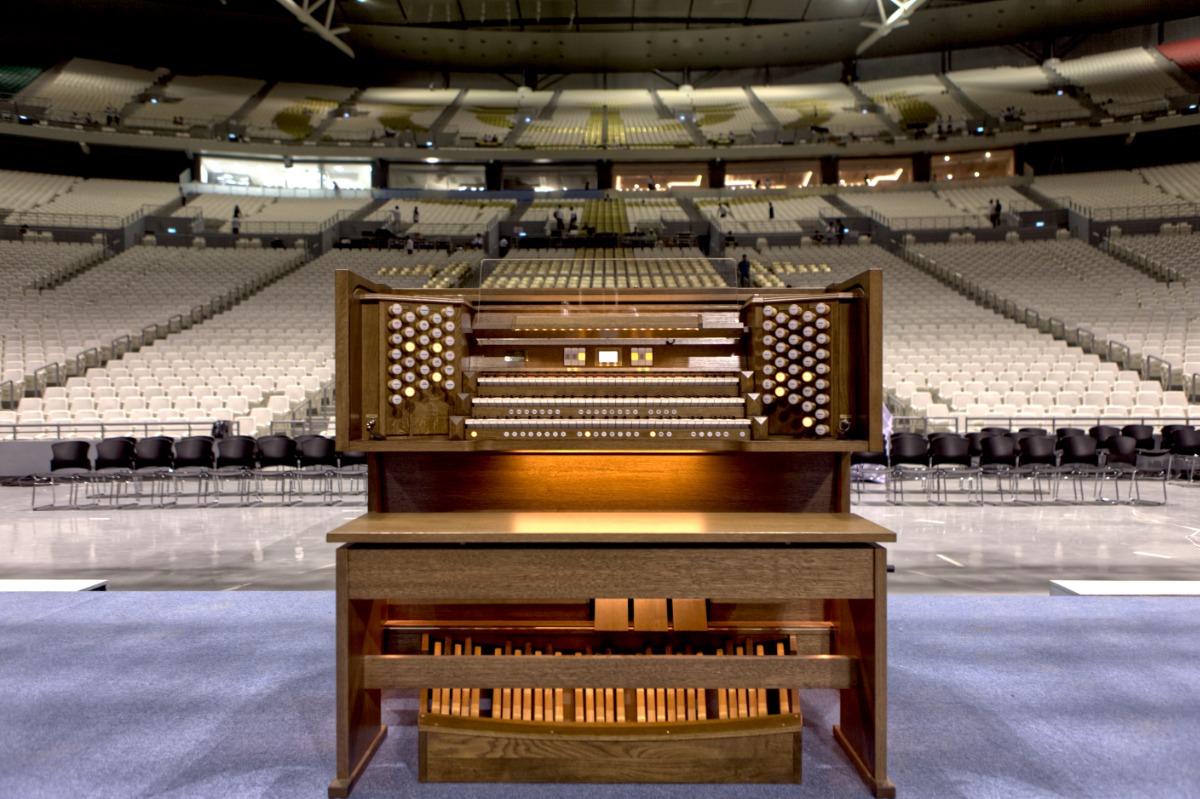 Het orgel, een Monarke, moest from scratch worden ontworpen. Het werd een drieklaviers orgel, met meer dan honderd versterkers, ruim 250 luidsprekers en tientallen subwoofers. “Omdat we al jaren aan deze geloofsgemeenschap leverden, wisten we wel ongeveer in welke richting we moesten denken qua stijl. De spanning stond vooral op de omvang van de arena. Voor zo’n grote ruimte hadden we niet eerder een orgel ontworpen.”